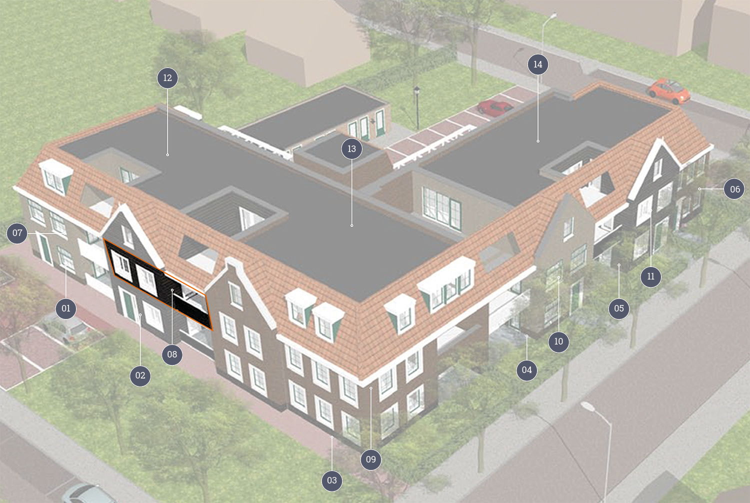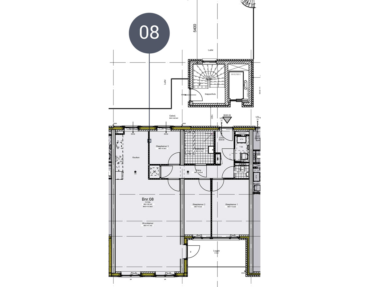 Bouwnummer 08 (Fleur) heeft een woonoppervlakte van ca. 99 m2. Deze woning bevindt zich op de 1e verdieping en heeft een buitenruimte in de vorm van een loggia (van ca. 9 m2).