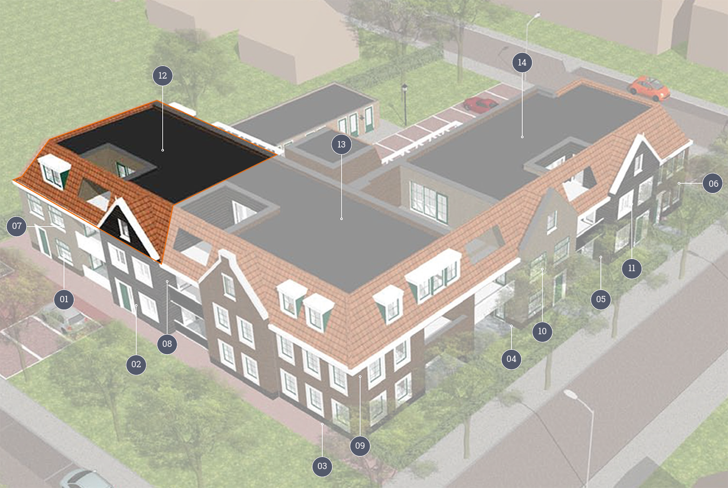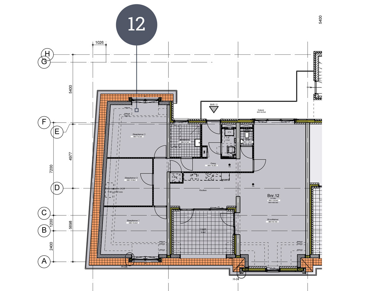 Penthouse Gardenia met bouwnummer 12 heeft een woonoppervlakte van ca. 138 m2. Deze woning bevindt zich op de begane grond en heeft een buitenruimte in de vorm van een dakterras (van ca. 15 m2).